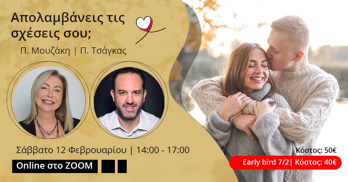 Δηλώστε συμμετοχή στο webinar "Πώς να απολαμβάνεις τις σχέσεις σου" που θα παρουσιάσουν η Πέγκυ Μουζάκη και ο Παναγιώτης Τσάγκας το Σάββατο 12 Φεβρουαρίου 14.00-17.00